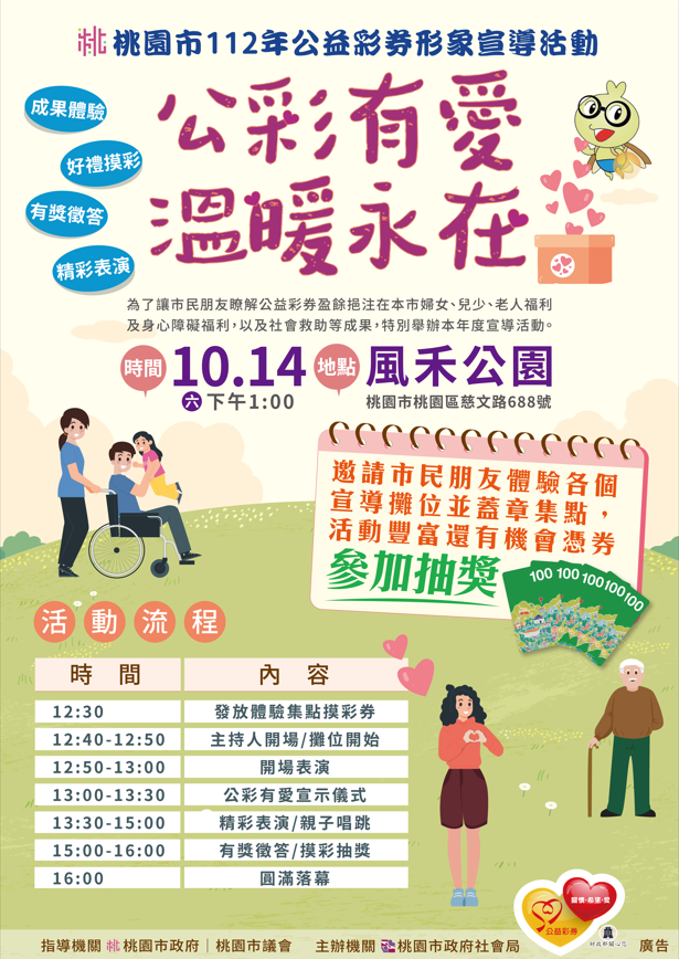 一、 | 本次活動訂於112年10月14日(星期六)下午1時至下午4時,假桃園區風禾公園辦理,現場規劃各社福機構及社會團體設攤,透過攤位體驗互動展現公彩成果,活動當天另有精彩表演、親子帶動跳和摸彩活動,歡迎踴躍參加。 |