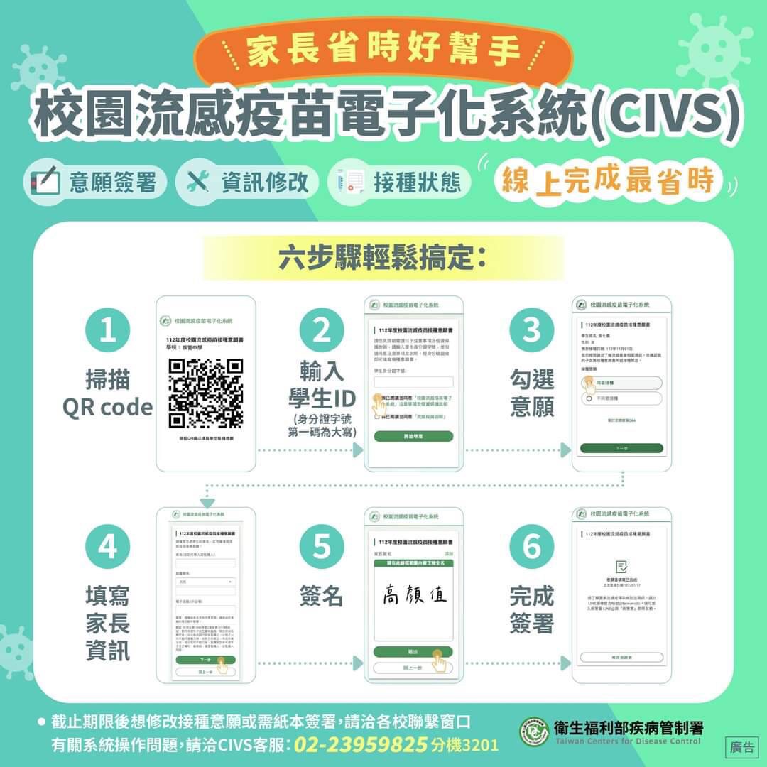 112學年度校園流感疫苗接種意願書,全面採行校園流感疫苗電子化系統(CIVS),改以線上填寫,請家長於10/11晚上23:59前完成填寫